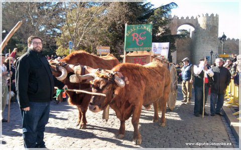 El presidente de la institución provincial ha recibido la vara de honor de manos de Juan Manuel Yuste, presidente de esta asociación que cuenta con más de sesenta miembros de la comarca de Gredos y que ha participado ayer por primera vez en la bendición que se realiza a los pies de la basílica de San Vicente con dos carros tirados por bueyes.