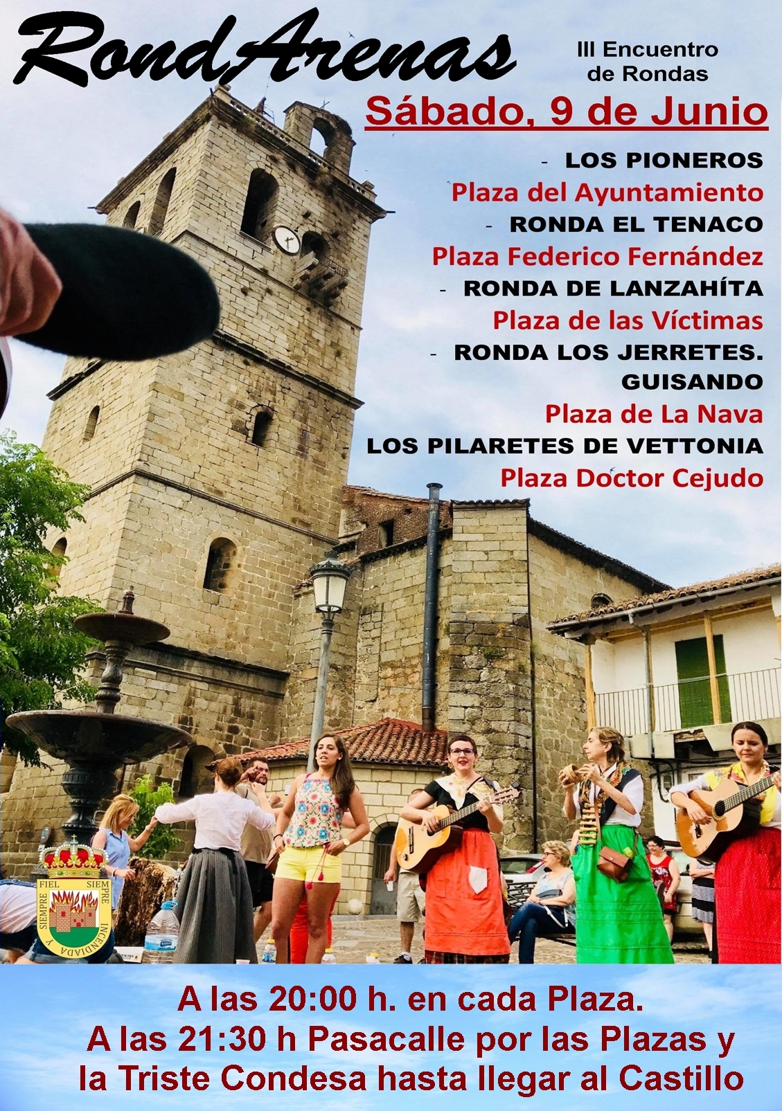 La Concejalía de Cultura del Excmo. Ayuntamiento de Arenas de San Pedro, ha organizado para el sábado, 9 de junio de 2018, a partir de las 20 h, el III Encuentro de Rondas, RondArenas, donde participarán rondas de Arenas de San Pedro, Guisando y Lanzahíta en las plazas más emblemáticas de la localidad.