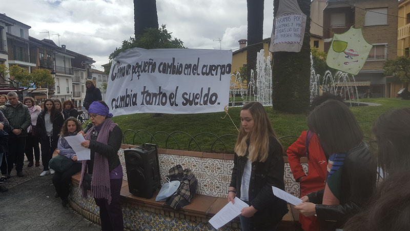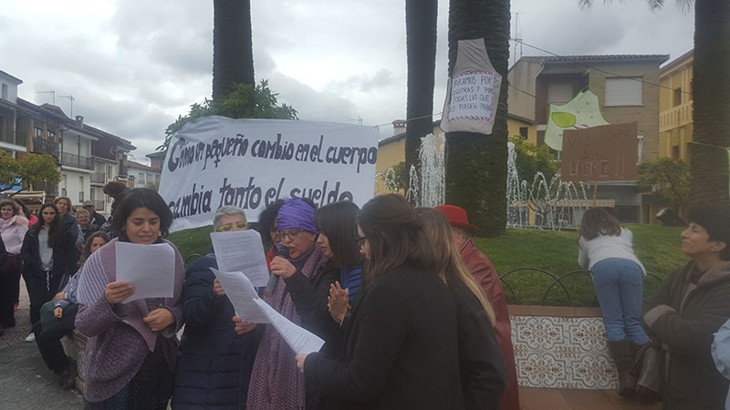 En el acto, un pequeño grupo de mujeres de varias generaciones leyeron el comunicado, reivindicando la huelga de este día así, como decir ¡Basta! De agresiones, humillaciones o exclusiones, opresión por las orientaciones e identidades sexuales, Discriminación salarial por el hecho de ser mujer, de menosprecio y de acoso sexual en el ámbito laboral, así como que ser mujer sea la principal causa de pobreza.