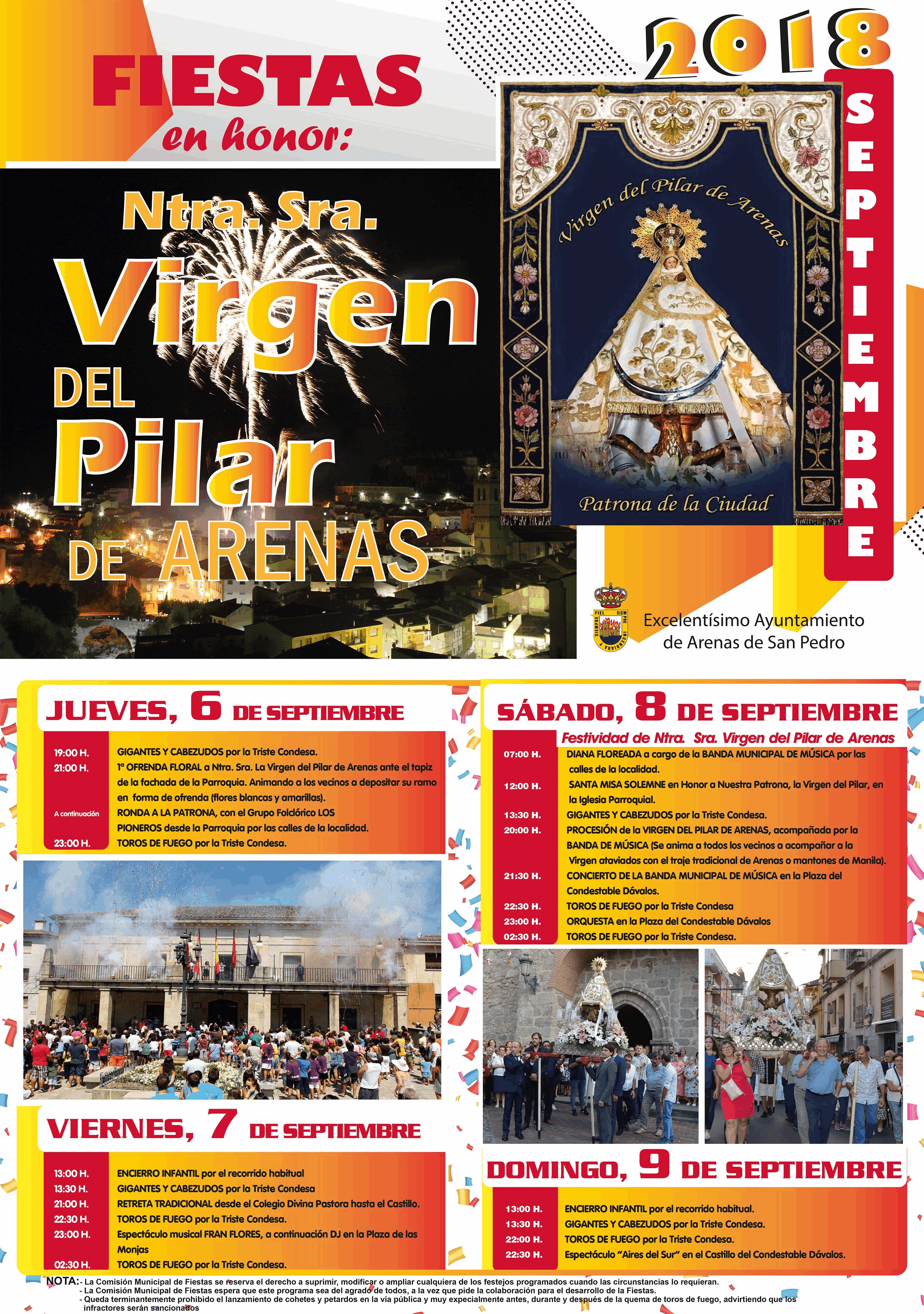 Desde la Concejalía de Fiestas del Ayuntamiento de Arenas de San Pedro, presentan la programación y el cartel para las Fiestas en honor a Nuestra Señora del Pilar de Arenas.